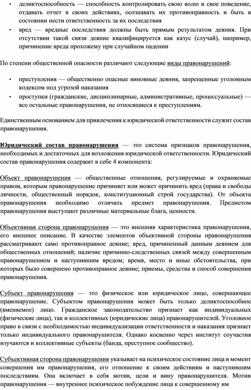 Отсутствие хотя бы одного из признаков свидетельствует об отсутствии юридической ответственности и позволяет отграничивать ее от других правовых и неправовых категорий.