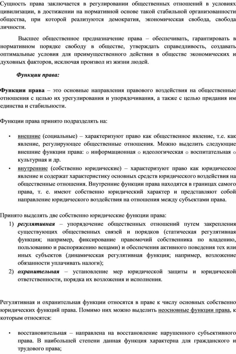 Высшее общественное предназначение права – обеспечивать, гарантировать в нормативном порядке свободу в обществе, утверждать справедливость, создавать оптимальные условия для преимущественного действия в обществе экономических и духовных факторов, исключая произвол из жизни людей.