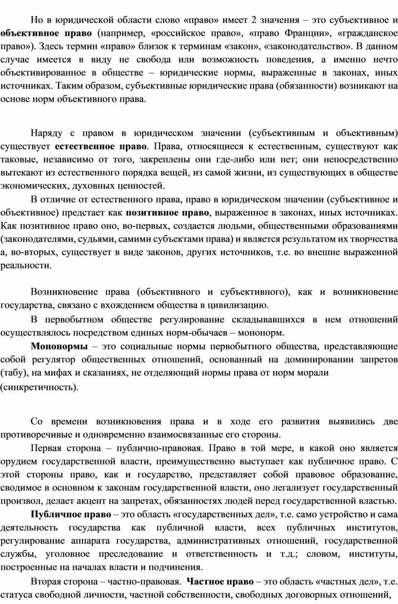 Но в юридической области слово «право» имеет 2 значения – это субъективное и объективное право (например, «российское право», «право Франции», «гражданское право»). Здесь термин «право» близок к терминам «закон», «законодательство». В данном случае имеется в виду не свобода или возможность поведения, а именно нечто объективированное в обществе – юридические нормы, выраженные в законах, иных источниках. Таким образом, субъективные юридические права (обязанности) возникают на основе норм объективного права.