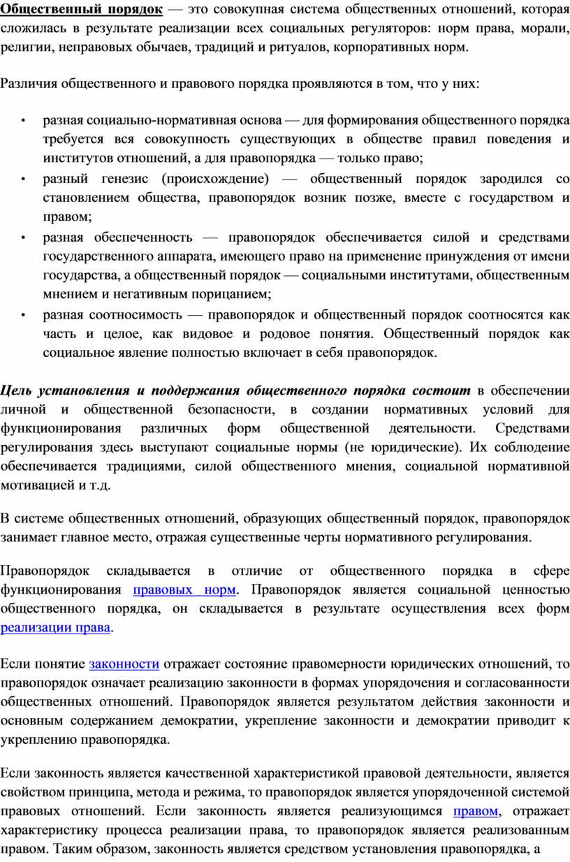 Общественный порядок — это совокупная система общественных отношений, которая сложилась в результате реализации всех социальных регуляторов: норм права, морали, религии, неправовых обычаев, традиций и ритуалов, корпоративных норм.
