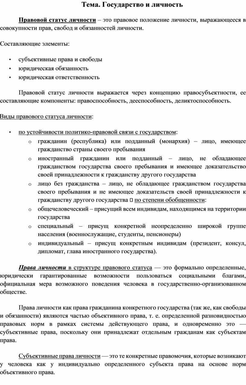 Правовой статус личности выражается через концепцию правосубъектности, ее составляющие компоненты: правоспособность, дееспособность, деликтоспособность.