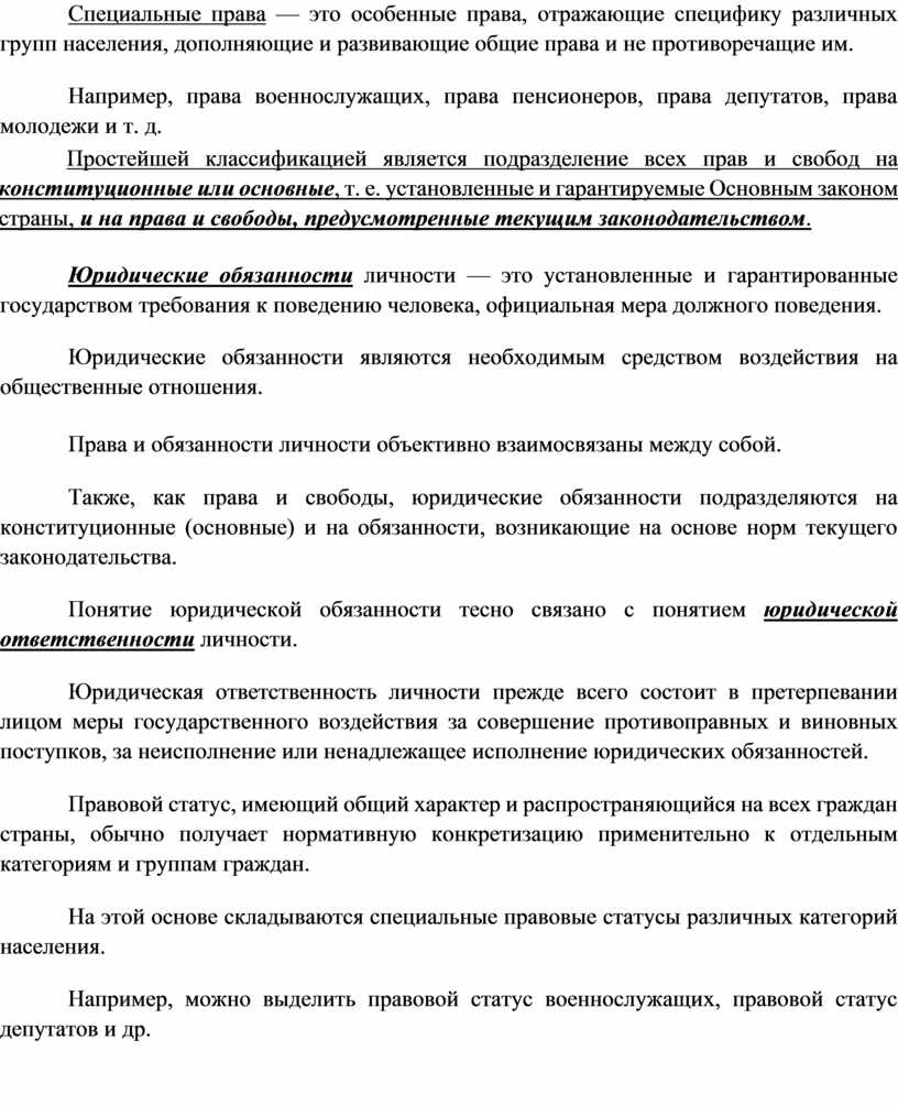 Специальные права — это особенные права, отражающие специфику различных групп населения, дополняющие и развивающие общие права и не противоречащие им.