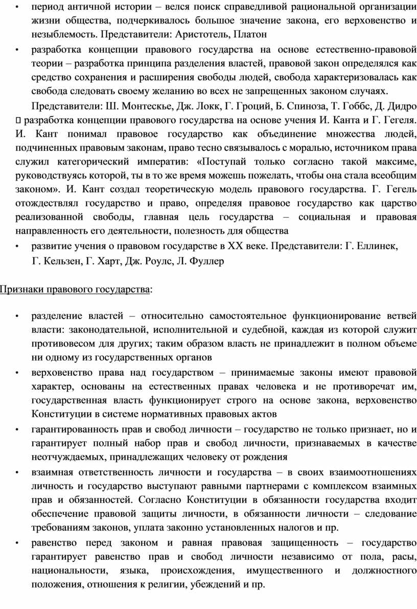 Представители: Ш. Монтескье, Дж. Локк, Г. Гроций, Б. Спиноза, Т. Гоббс, Д. Дидро разработка концепции правового государства на основе учения И. Канта и Г. Гегеля. И. Кант понимал правовое государство как объединение множества людей, подчиненных правовым законам, право тесно связывалось с моралью, источником права служил категорический императив: «Поступай только согласно такой максиме, руководствуясь которой, ты в то же время можешь пожелать, чтобы она стала всеобщим законом». И. Кант создал теоретическую модель правового государства. Г. Гегель отождествлял государство и право, определяя правовое государство как царство реализованной свободы, главная цель государства – социальная и правовая направленность его деятельности, полезность для общества