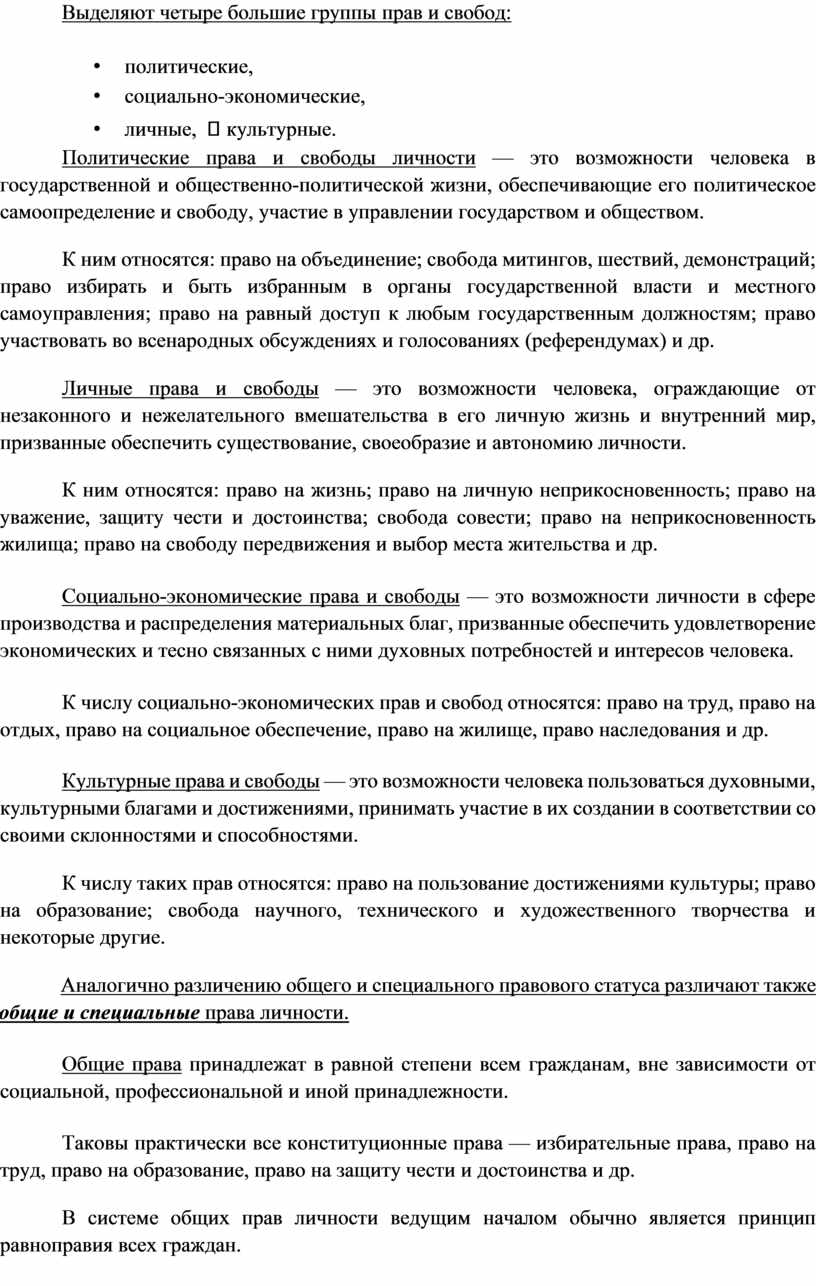 Выделяют четыре большие группы прав и свобод: