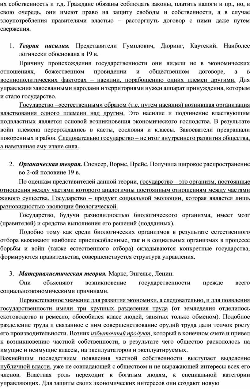 Причину происхождения государственности они видели не в экономических отношениях, божественном провидении и общественном договоре, а в военнополитических факторах – насилии, порабощению одних племен другими. Для управления завоеванными народами и территориями нужен аппарат принуждения, которым и стало государство.