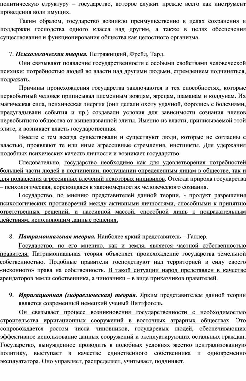 Они связывают появление государственности с особыми свойствами человеческой психики: потребностью людей во власти над другими людьми, стремлением подчиняться, подражать.