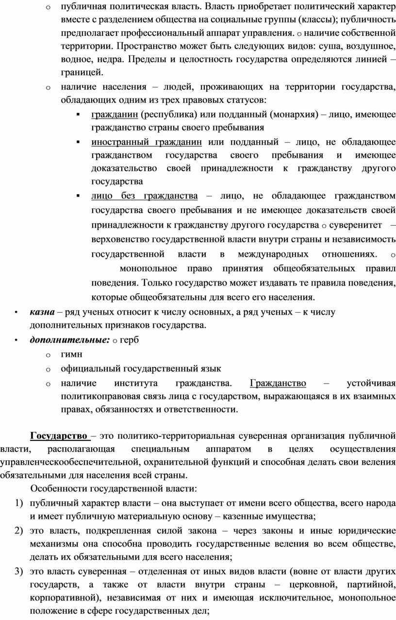 o публичная политическая власть. Власть приобретает политический характер вместе с разделением общества на социальные группы (классы); публичность предполагает профессиональный аппарат управления. o наличие собственной территории. Пространство может быть следующих видов: суша, воздушное, водное, недра. Пределы и целостность государства определяются линией – границей.