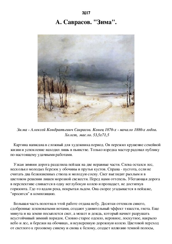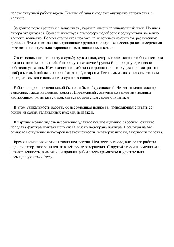 Узкая зимняя дорога разделила пейзаж на две неравные части. Слева остался лес, несколько молодых березок у обочины и прутья кустов. Справа - пустота, если не считать два безжизненных ствола и молодую сосну. Снег выглядит рыхлым и в цветовом решении лишен морозной свежести. Перед нами оттепель. Убегающая дорога в перспективе сливается в одну неглубокую колею и пропадает, не достигнув горизонта. Где-то вдали река, покрытая льдом. Она скорее угадывается в пейзаже, "просится" в композицию.Словно старое одеяло, неровное, лоскутное, накрыло небо и лес, и березки на обочинах, и неуверенную дорожную колею. Цветовой переход от светлого к грозовому синему и снова к белому, создает иллюзию темной полосы, перечеркнувшей работу вдоль. Темные облака и создают ощущение напряжения в картине.