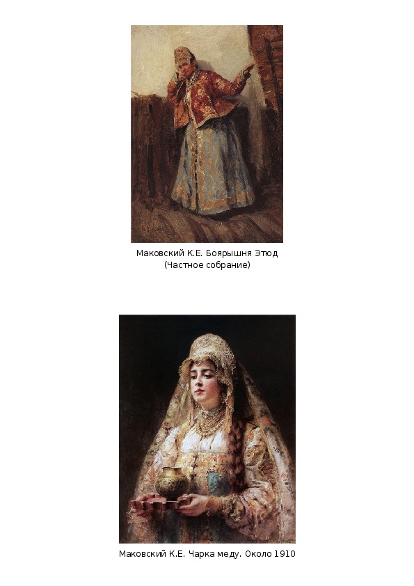В 1880-х он стал модным автором портретов и исторических картин. В творчестве Маковского родился особый жанровый подвид: головки боярышень. Чернобровые, с длинными опущенными ресницами, меланхоличные или задорные, в кокошниках разной формы, с бантами, серьгами, ожерельями, они составили целую галерею русских красавиц. Одни из этих головок вошли в различные "боярские" картины, другие существовали сами по себе...Константин Егорович Маковский был одним из самых востребованных и модных художников России. Художественное наследие К.Е.Маковского весьма значительно, и львиная доля его работ оказалась в частных коллекциях и по объемам продаж его произведения сравнимы разве что с полотнами Айвазовского.