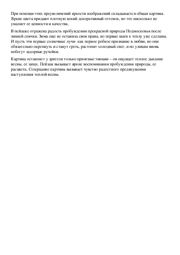 Вероятно, они вышли на конную прогулку в такую прекрасную погоду, радуясь первому весеннему солнышку.Пейзаж оставляет только положительные эмоции. Видение дневного пейзажа художник отразил в картине с преувеличением. Снег стал еще белее, деревья – еще ярче, а лошади – чернее.