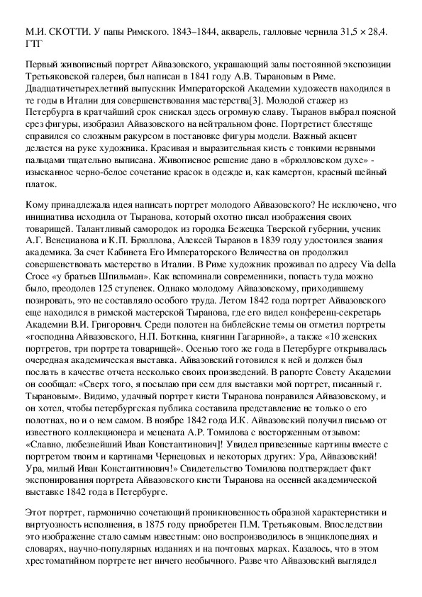 Третьяковской галереи, был написан в 1841 году А.В. Тырановым в Риме.