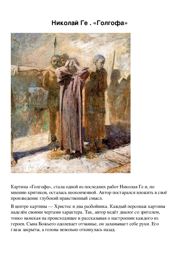 Картина «Голгофа», стала одной из последних работ Николая Ге и, по мнению критиков, осталась неоконченной. Автор постарался вложить в своё произведение глубокий нравственный смысл.