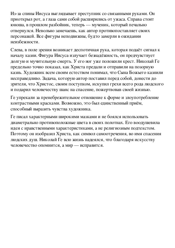 В центре картины — Христос и два разбойника. Каждый персонаж картины наделён своими чертами характера. Так, автор ведёт диалог со зрителем, тонко намекая на происходящее и рассказывая о настроении каждого из героев. Сына Божьего одолевает отчаянье, он заламывает себе руки. Его глаза закрыты, а голова невольно откинулась назад.. Николай Ге всю жизнь надеялся, что благодаря искусству человечество опомнится, а мир — исправится.