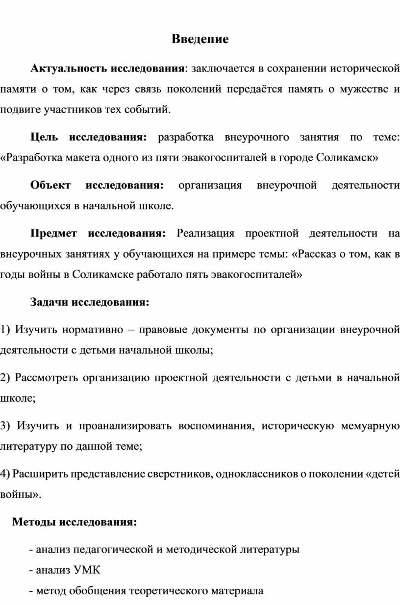 Предмет исследования: Реализация проектной деятельности на внеурочных занятиях у обучающихся на примере темы: «Рассказ о том, как в годы войны в Соликамске работало пять эвакогоспиталей»
