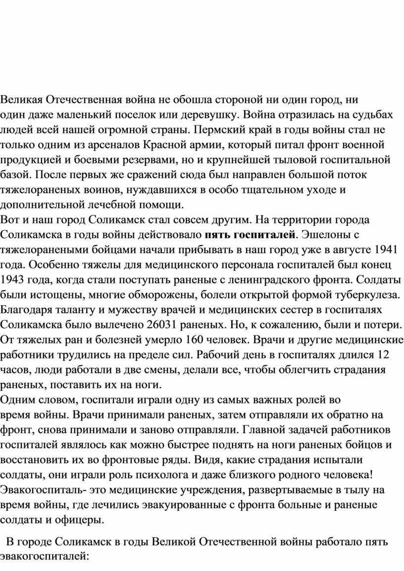 В городе Соликамск в годы Великой Отечественной войны работало пять эвакогоспиталей: