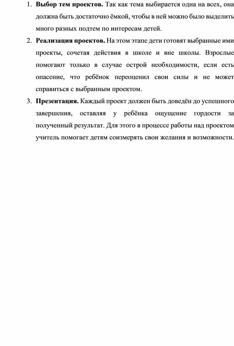 5. Реализация проектов. На этом этапе дети готовят выбранные ими проекты, сочетая действия в школе и вне школы. Взрослые помогают только в случае острой необходимости, если есть опасение, что ребёнок переоценил свои силы и не может справиться с выбранным проектом.