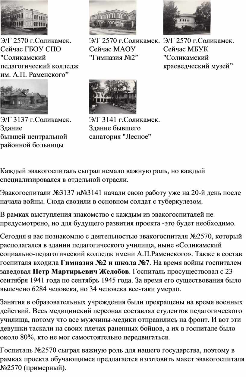 Сегодня я вас познакомлю с деятельностью эвакогоспиталя №2570, который располагался в здании педагогического училища, ныне «Соликамский социально-педагогический колледж имени А.П.Раменского». Также в состав госпиталя входила Гимназия №2 и школа №7. На время войны госпиталем заведовал Петр Мартирьевич Желобов. Госпиталь просуществовал с 23 сентября 1941 года по сентябрь 1945 года. За время его существования было вылечено 6284 человека, но 34 человека все-таки умерло.