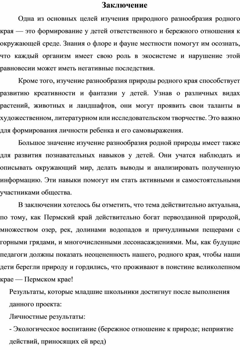 В заключении хотелось бы отметить, что тема действительно актуальна, по тому, как Пермский край действительно богат первозданной природой, множеством озер, рек, долинами водопадов и причудливыми пещерами с горными грядами, и многочисленными лесонасаждениями. Мы, как будущие педагоги должны показать неоцененность нашего, родного края, чтобы наши дети берегли природу и гордились, что проживают в поистине великолепном крае — Пермском крае!