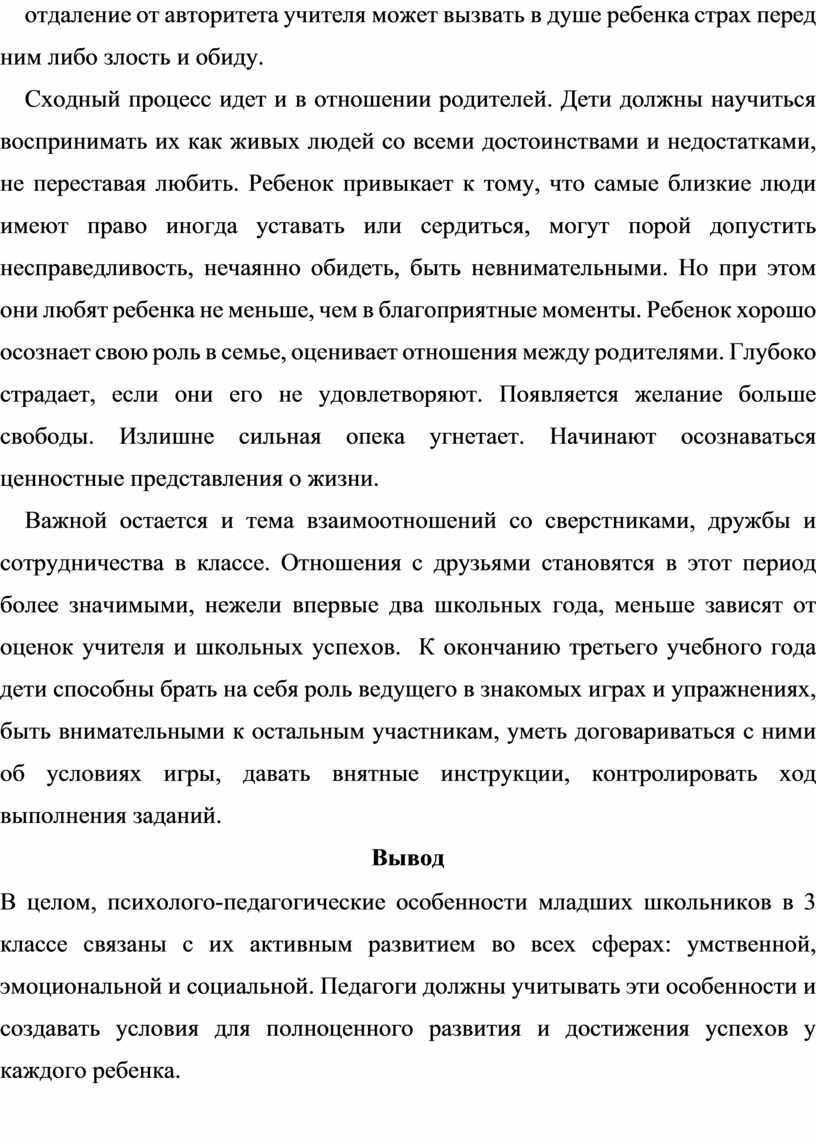 В целом, психолого-педагогические особенности младших школьников в 3 классе связаны с их активным развитием во всех сферах: умственной, эмоциональной и социальной. Педагоги должны учитывать эти особенности и создавать условия для полноценного развития и достижения успехов у каждого ребенка.