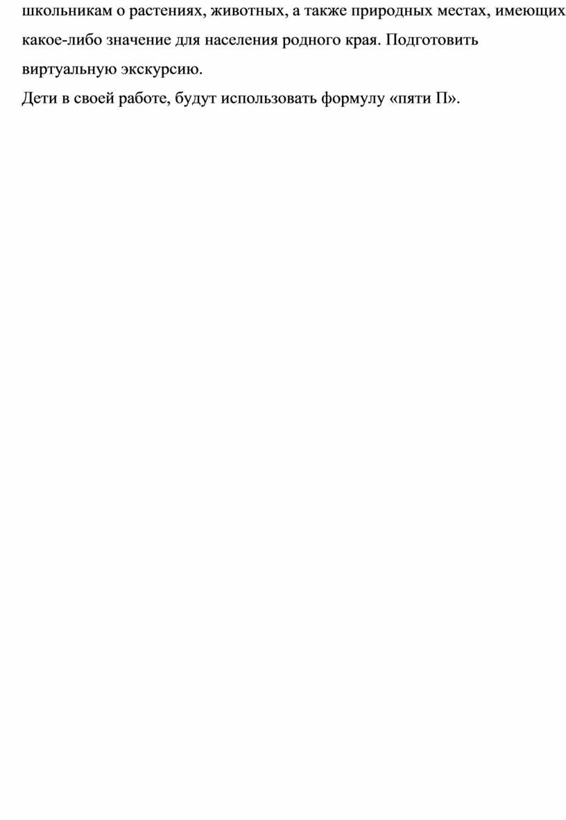Младшим школьникам нужно будет найти информацию о многообразии природы родного края и поделится ею с одноклассниками. Рассказать школьникам о растениях, животных, а также природных местах, имеющих какое-либо значение для населения родного края. Подготовить виртуальную экскурсию.