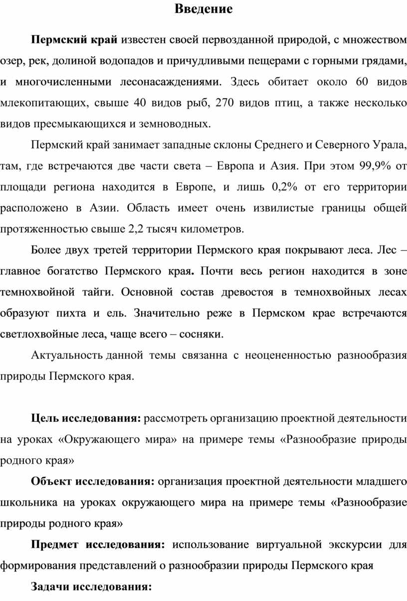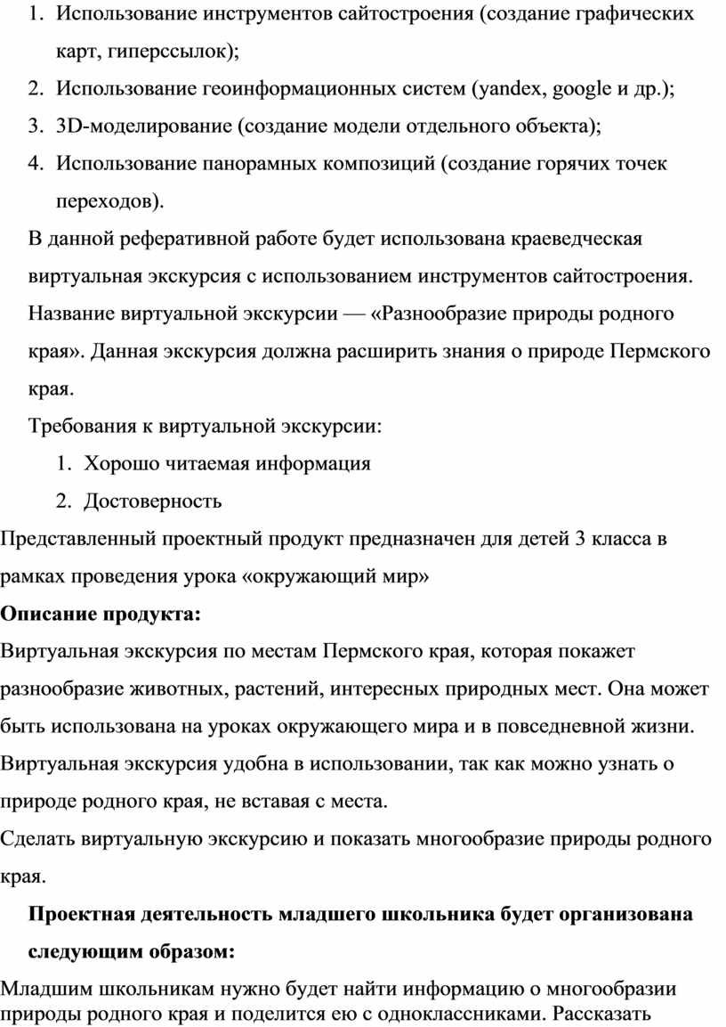 В данной реферативной работе будет использована краеведческая виртуальная экскурсия с использованием инструментов сайтостроения. Название виртуальной экскурсии — «Разнообразие природы родного края». Данная экскурсия должна расширить знания о природе Пермского края.