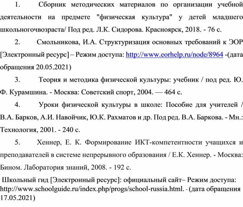 9. Ги ль фа но ва С. А. «Ур ок фи зи че ск ой ку ль ту ры в со от ве тс тв ии с тр еб ов ан ия ми ФГ ОС » [эл ек тр он ны й ре су рс ] – Режим доступа: ht tp ://ww w.me to d-ko pi lk a.ru / - (да та об ра ще ни я 18.05.2021 г.)