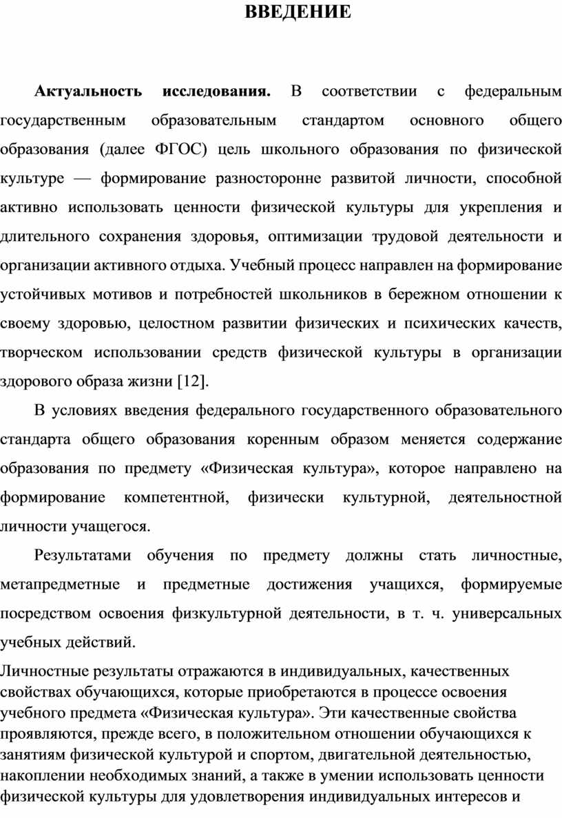 Актуальность исследования. В соответствии с федеральным государственным образовательным стандартом основного общего образования (далее ФГОС) цель школьного образования по физической культуре — формирование разносторонне развитой личности, способной активно использовать ценности физической культуры для укрепления и длительного сохранения здоровья, оптимизации трудовой деятельности и организации активного отдыха. Учебный процесс направлен на формирование устойчивых мотивов и потребностей школьников в бережном отношении к своему здоровью, целостном развитии физических и психических качеств, творческом использовании средств физической культуры в организации здорового образа жизни [12].