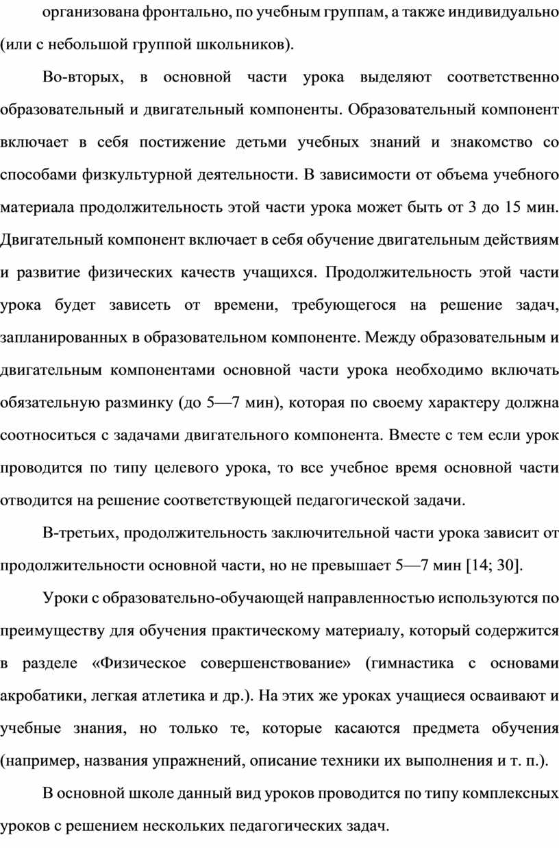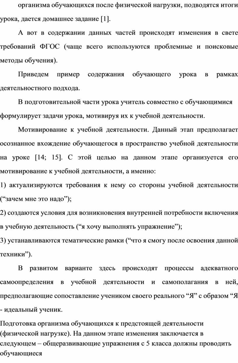 Ст ру кт ур а ур ок а фи зи че ск ой ку ль ту ры ос та ет ся не из ме нн ой – тр и ча ст и ур ок а: по дг от ов ит ел ьн ая , ос но вн ая и за кл юч ит ел ьн ая . В по дг от ов ит ел ьн ой ча ст и ур ок а – мы по дг от ав ли ва ем ор га ни зм об уч аю ще го ся к пр ед ст оя ще й де ят ел ьн ос ти , на ст ра ив ае м ег о на ра бо ту . В ос но вн ой ча ст и ур ок а – ид ет ос во ен ие но вы х зн ан ий , ум ен ий и на вы ко в (об уч ен ие те хн ик е фи зи че ск их уп ра жн ен ий ), их со ве рш ен ст во ва ни е и за кр еп ле ни е, ра зв ит ие фи зи че ск их ка че ст в на их ос но ве сп ос об но ст ей , во сп ит ан ие ли чн ос тн ых ка че ст в об уч аю ще го ся . В за кл юч ит ел ьн ой ча ст и ур ок а - ид ет во сс та но вл ен ие ор га ни зм а об уч аю щи хс я по сл е фи зи че ск ой на гр уз ки , по дв од ят ся ит ог и ур ок а, да ет ся до ма шн ее за да ни е [1].