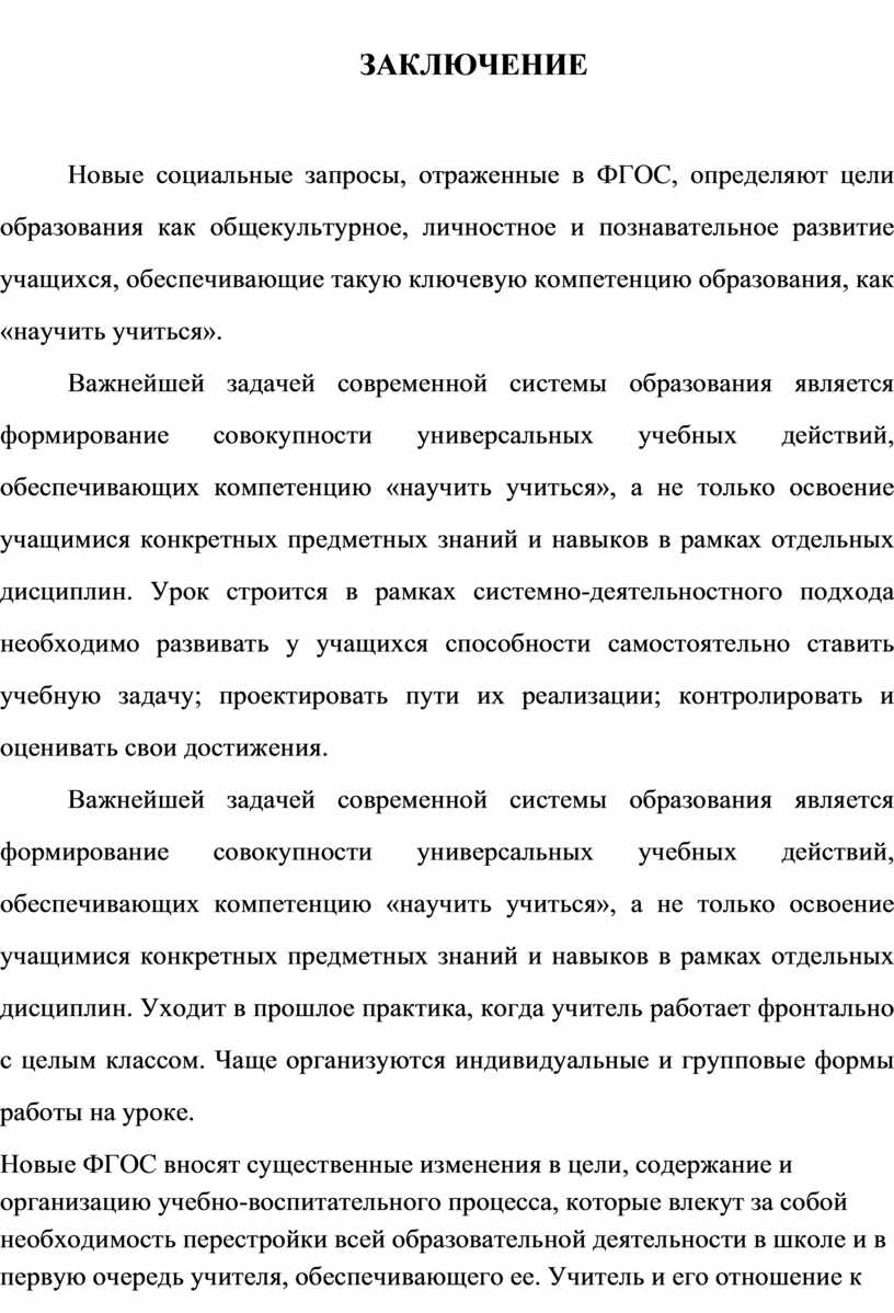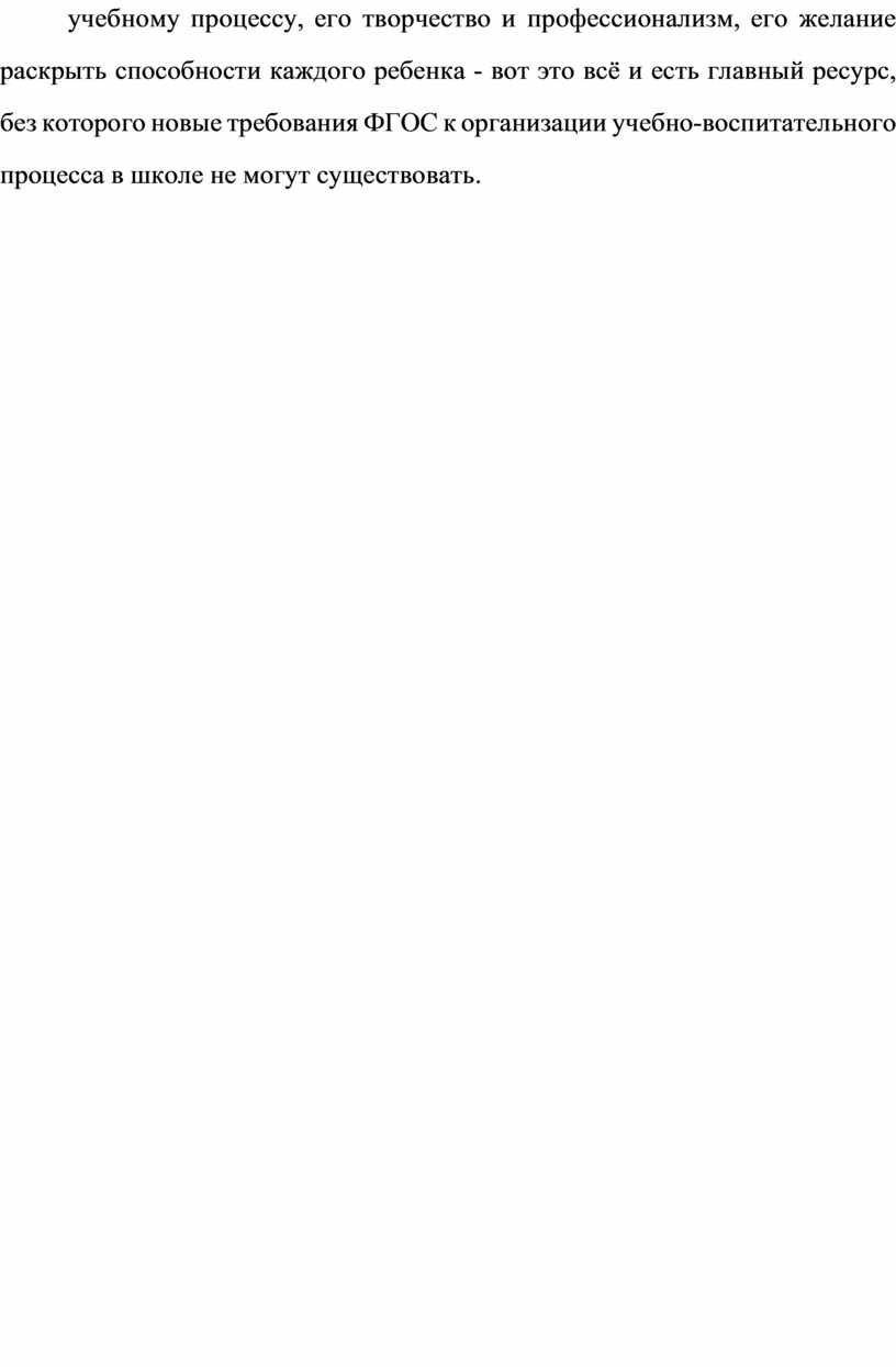 Но вы е ФГ ОС вн ос ят су ще ст ве нн ые из ме не ни я в це ли , со де рж ан ие и ор га ни за ци ю уч еб но -во сп ит ат ел ьн ог о пр оц ес са , ко то ры е вл ек ут за со бо й не об хо ди мо ст ь пе ре ст ро йк и вс ей об ра зо ва те ль но й де ят ел ьн ос ти в шк ол е и в пе рв ую оч ер ед ь уч ит ел я, об ес пе чи ва ющ ег о ее . Уч ит ел ь и ег о от но ше ни е к уч еб но му пр оц ес су , ег о тв ор че ст во и пр оф ес си он ал из м, ег о же ла ни е ра ск ры ть сп ос об но ст и ка жд ог о ре бе нк а - во т эт о вс ё и ес ть гл ав ны й ре су рс , бе з ко то ро го но вы е тр еб ов ан ия ФГ ОС к ор га ни за ци и уч еб но -во сп ит ат ел ьн ог о пр оц ес са в шк ол е не мо гу т су ще ст во ва ть .