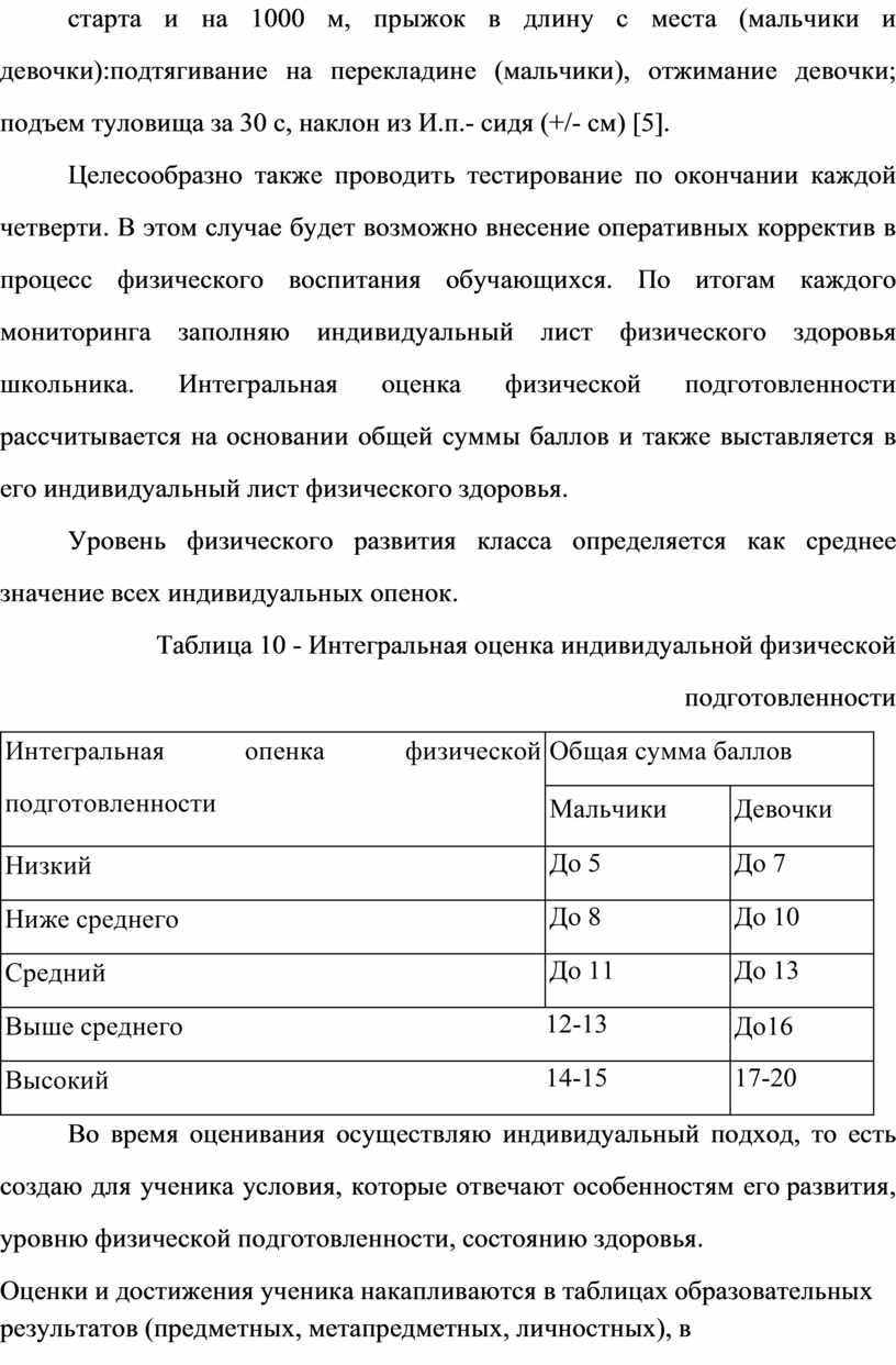 Таблица 10 - Ин те гр ал ьн ая оц ен ка ин ди ви ду ал ьн ой фи зи че ск ой по дг от ов ле нн ос ти