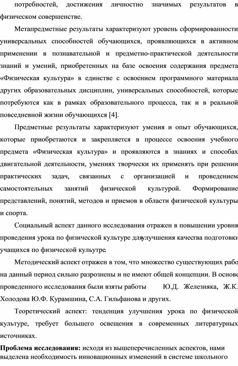 Проблема исследования: исходя из вышеперечисленных аспектов, нами выделена необходимость инновационных изменений в системе школьного физического воспитания, и в первую очередь в проектировании уроков физической культуры, как основной действующей в школе формы учебного процесса. Основная масса современных школьников никакой двигательной активности, кроме как на обязательных уроках физической культуры, не получают. Поэтому учителя физической культуры должны с максимальной эффективностью проектировать современный урок физической культуры в соответствии с требованиями ФГОС.