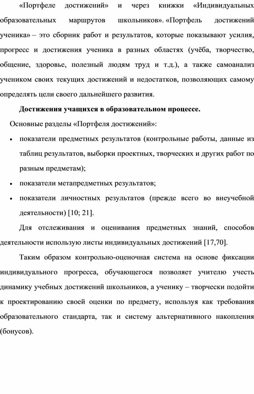 Оц ен ки и до ст иж ен ия уч ен ик а на ка пл ив аю тс я в та бл иц ах об ра зо ва те ль ны х ре зу ль та то в (пр ед ме тн ых , ме та пр ед ме тн ых , ли чн ос тн ых ), в «По рт фе ле до ст иж ен ий » и че ре з кн иж ки «Ин ди ви ду ал ьн ых об ра зо ва те ль ны х ма рш ру то в шк ол ьн ик ов ». «По рт фе ль до ст иж ен ий уч ен ик а» – эт о сб ор ни к ра бо т и ре зу ль та то в, ко то ры е по ка зы ва ют ус ил ия , пр ог ре сс и до ст иж ен ия уч ен ик а в ра зн ых об ла ст ях (уч ёб а, тв ор че ст во , об ще ни е, зд ор ов ье , по ле зн ый лю дя м тр уд и т.д.), а та кж е са мо ан ал из уч ен ик ом св ои х те ку щи х до ст иж ен ий и не до ст ат ко в, по зв ол яю щи х са мо му оп ре де ля ть це ли св ое го да ль не йш ег о ра зв ит ия .