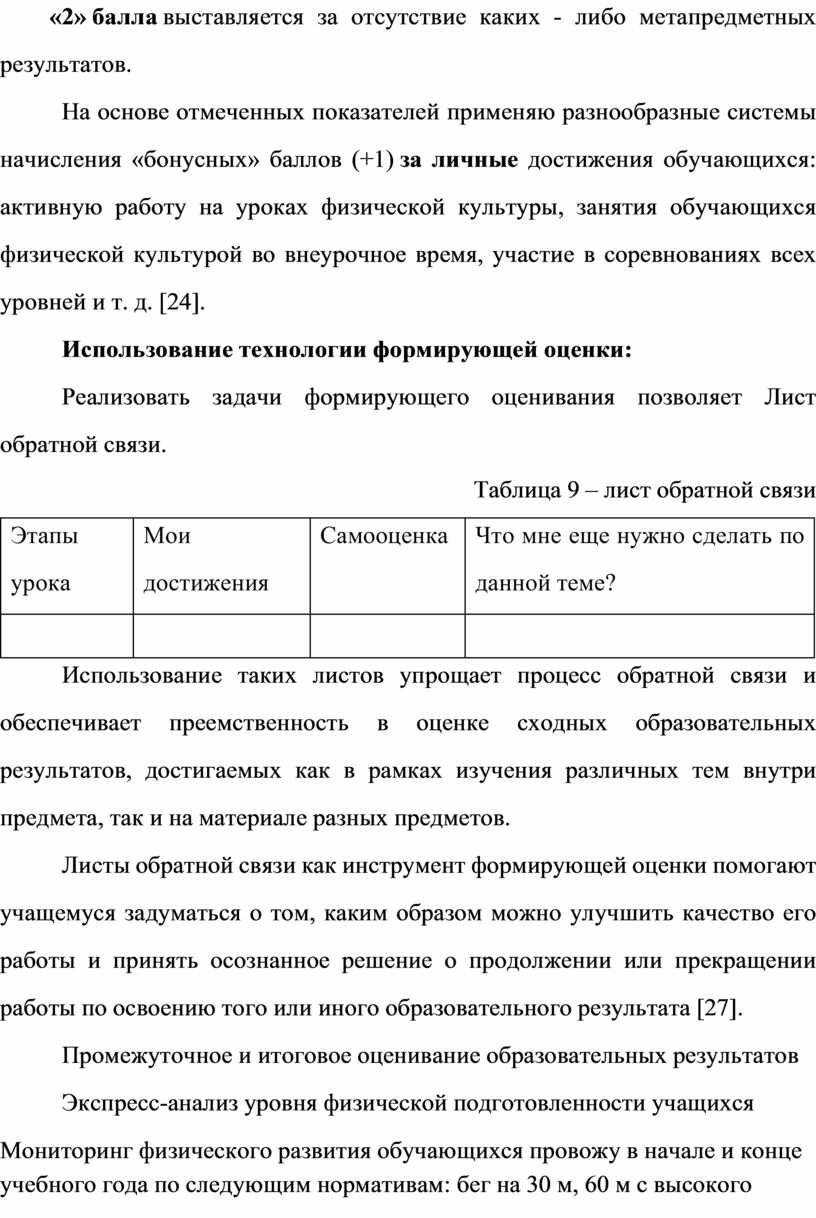 На ос но ве от ме че нн ых по ка за те ле й пр им ен яю ра зн оо бр аз ны е си ст ем ы на чи сл ен ия «бо ну сн ых » ба лл ов (+1) за ли чн ые до ст иж ен ия об уч аю щи хс я: ак ти вн ую ра бо ту на ур ок ах фи зи че ск ой ку ль ту ры , за ня ти я об уч аю щи хс я фи зи че ск ой ку ль ту ро й во вн еу ро чн ое вр ем я, уч ас ти е в со ре вн ов ан ия х вс ех ур ов не й и т. д. [24].