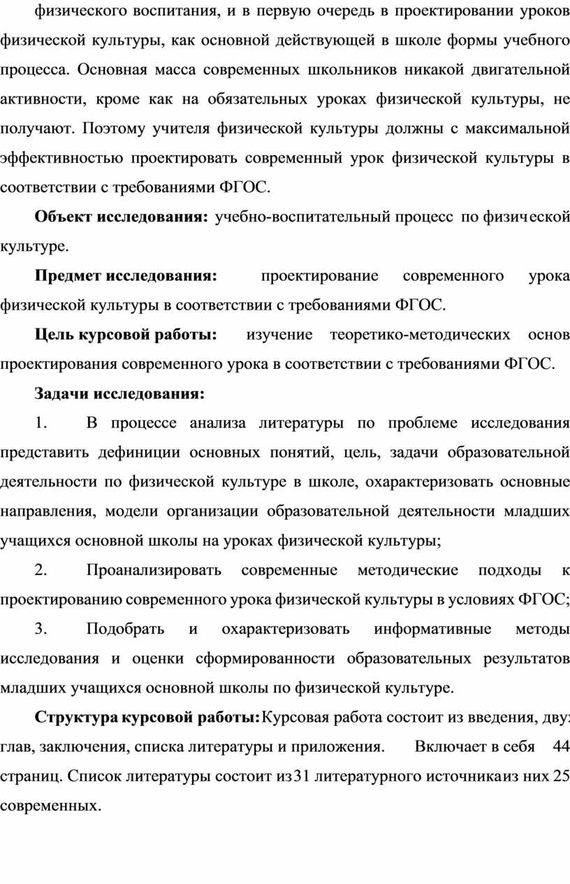 Предмет исследования: проектирование современного урока физической культуры в соответствии с требованиями ФГОС.