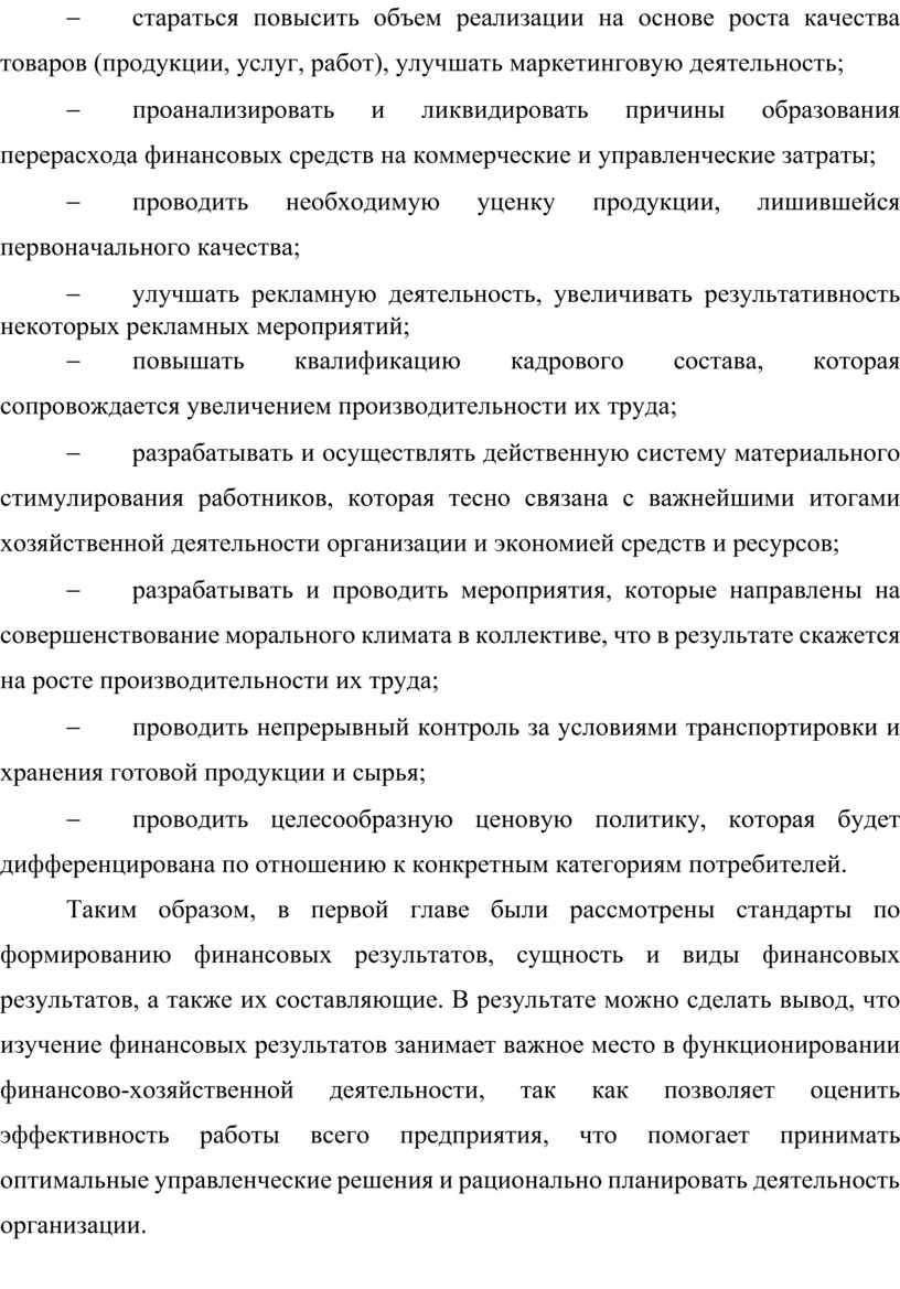 Таким образом, в первой главе были рассмотрены стандарты по формированию финансовых результатов, сущность и виды финансовых результатов, а также их составляющие. В результате можно сделать вывод, что изучение финансовых результатов занимает важное место в функционировании финансово-хозяйственной деятельности, так как позволяет оценить эффективность работы всего предприятия, что помогает принимать оптимальные управленческие решения и рационально планировать деятельность организации.