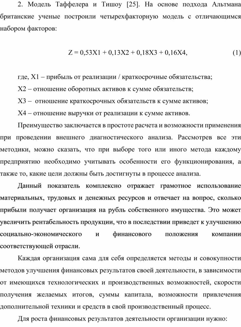 2. Модель Таффелера и Тишоу [25]. На основе подхода Альтмана британские ученые построили четырехфакторную модель с отличающимся набором факторов: