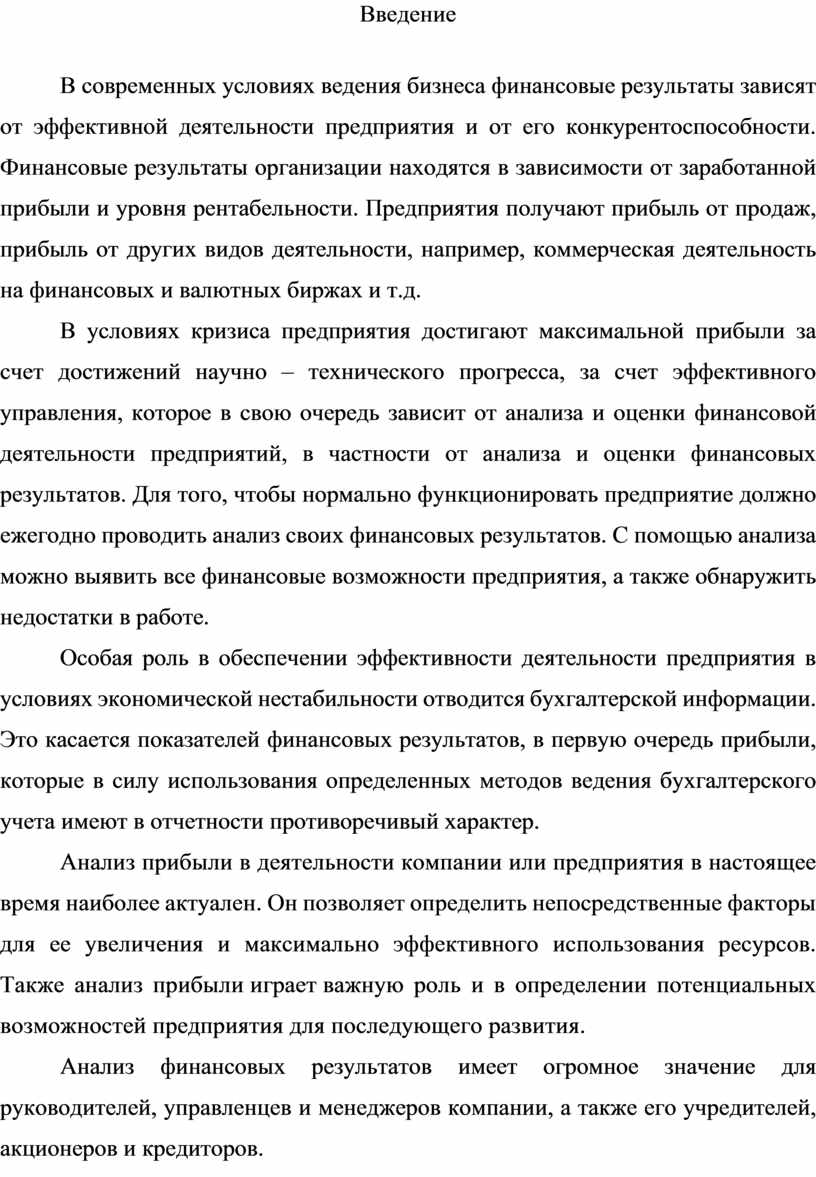 В условиях кризиса предприятия достигают максимальной прибыли за счет достижений научно – технического прогресса, за счет эффективного управления, которое в свою очередь зависит от анализа и оценки финансовой деятельности предприятий, в частности от анализа и оценки финансовых результатов. Для того, чтобы нормально функционировать предприятие должно ежегодно проводить анализ своих финансовых результатов. С помощью анализа можно выявить все финансовые возможности предприятия, а также обнаружить недостатки в работе.