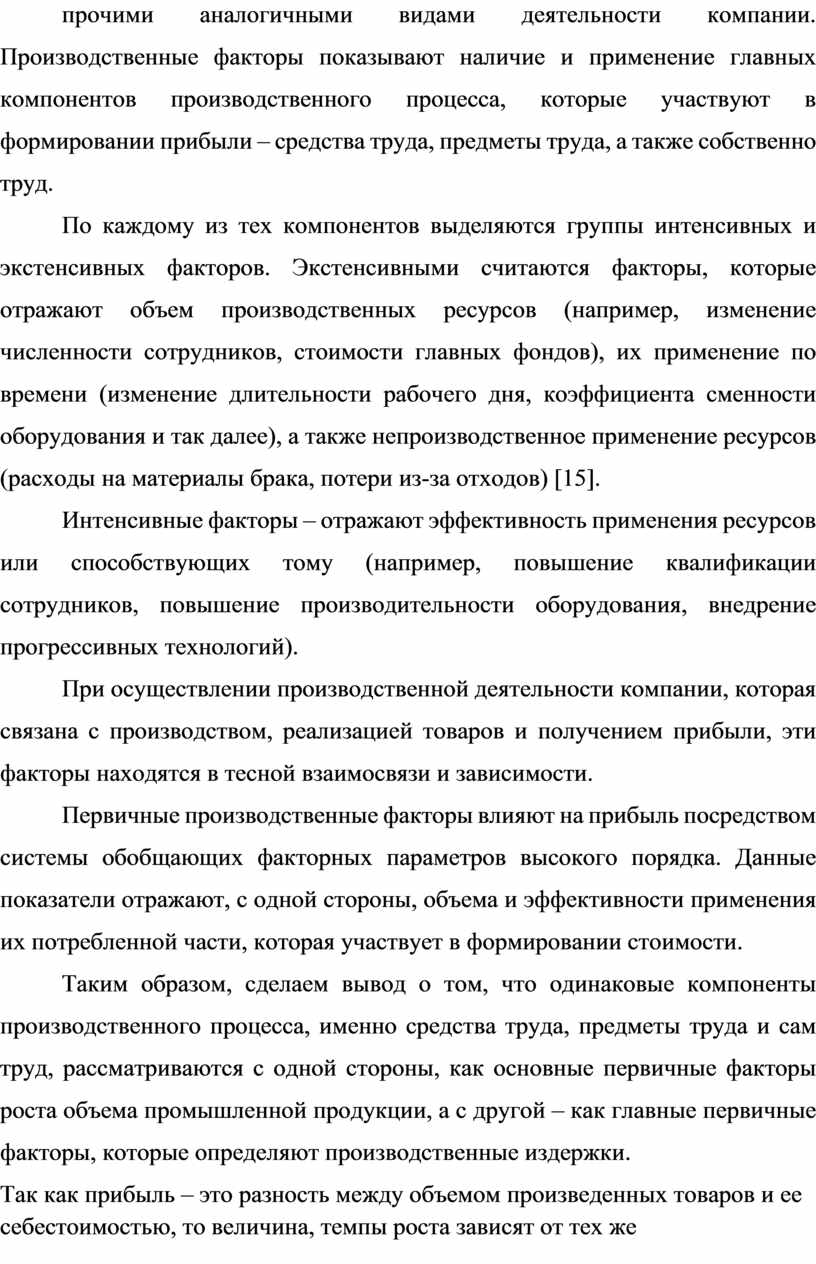 По каждому из тех компонентов выделяются группы интенсивных и экстенсивных факторов. Экстенсивными считаются факторы, которые отражают объем производственных ресурсов (например, изменение численности сотрудников, стоимости главных фондов), их применение по времени (изменение длительности рабочего дня, коэффициента сменности оборудования и так далее), а также непроизводственное применение ресурсов (расходы на материалы брака, потери из-за отходов) [15].