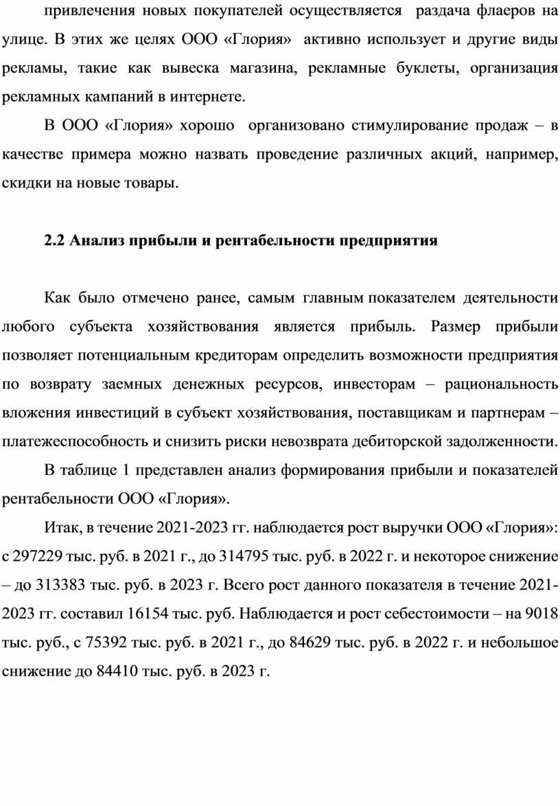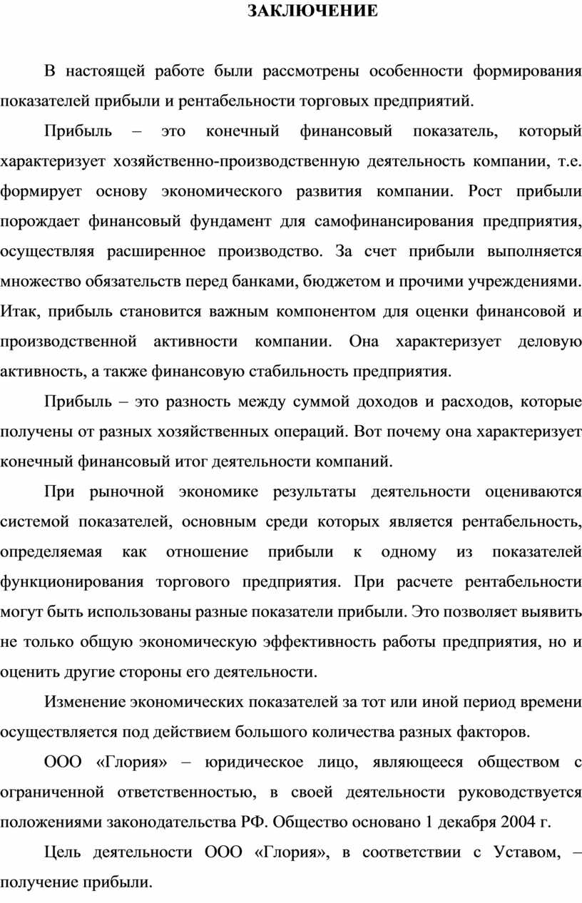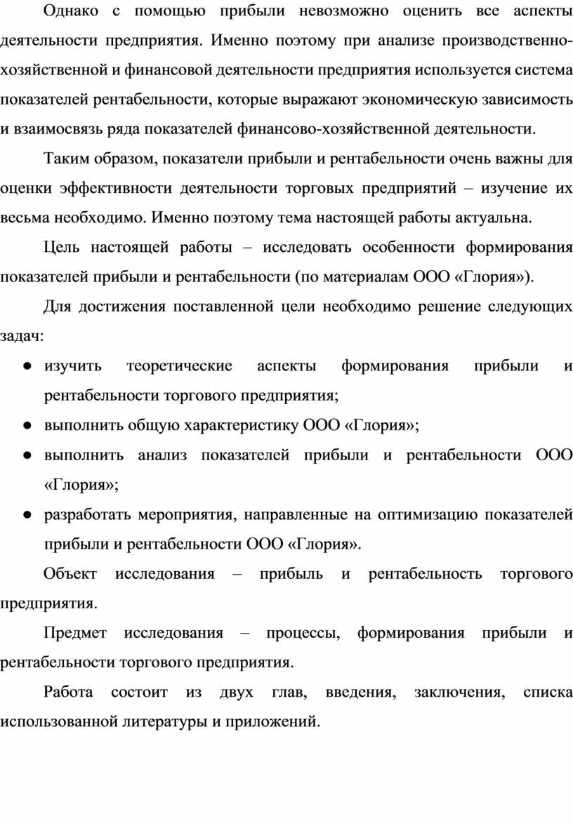 Цель настоящей работы – исследовать особенности формирования показателей прибыли и рентабельности (по материалам ООО «Глория»).