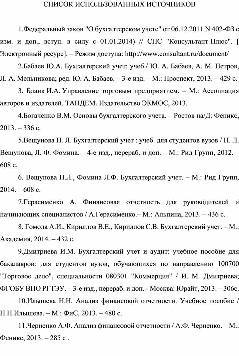 1.Федеральный закон "О бухгалтерском учете" от 06.12.2011 N 402-ФЗ с изм. и доп., вступ. в силу с 01.01.2014) // СПС "Консультант-Плюс". [ Электронный ресурс]. – Режим доступа: http://www.consultant.ru/document/