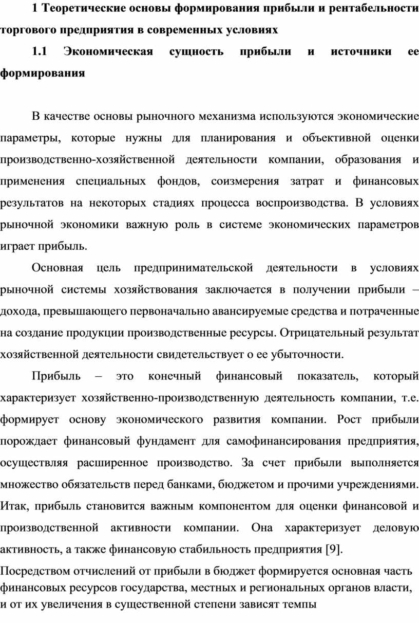 1 ТЕОРЕТИЧЕСКИЕ ОСНОВЫ ФОРМИРОВАНИЯ ПРИБЫЛИ И РЕНТАБЕЛЬНОСТИ ТОРГОВОГО ПРЕДПРИЯТИЯ В СОВРЕМЕННЫХ УСЛОВИЯХ....................................................................... |