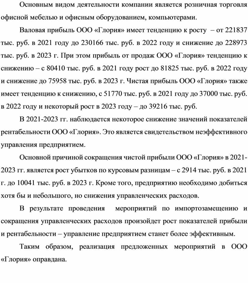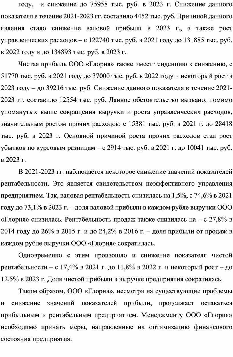 Основной причиной сокращения чистой прибыли ООО «Глория» в 2021-2023 гг. является рост убытков по курсовым разницам – с 2914 тыс. руб. в 2021 г. до 10041 тыс. руб. в 2023 г. Кроме того, предприятию необходимо добиться хотя бы и небольшого, но снижения управленческих расходов.