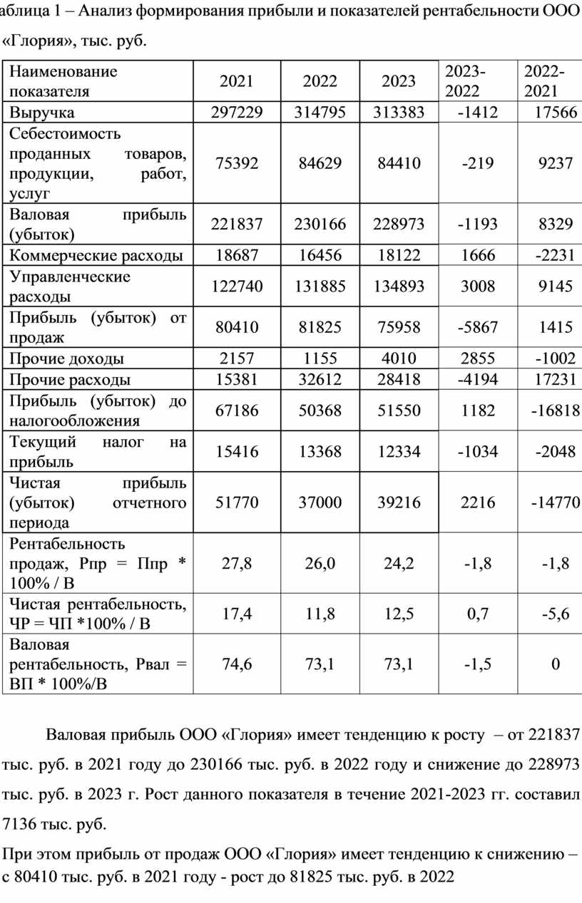 Валовая прибыль ООО «Глория» имеет тенденцию к росту – от 221837 тыс. руб. в 2021 году до 230166 тыс. руб. в 2022 году и снижение до 228973 тыс. руб. в 2023 г. При этом прибыль от продаж ООО «Глория» тенденцию к снижению – с 80410 тыс. руб. в 2021 году рост до 81825 тыс. руб. в 2022 году и снижение до 75958 тыс. руб. в 2023 г. Чистая прибыль ООО «Глория» также имеет тенденцию к снижению, с 51770 тыс. руб. в 2021 году до 37000 тыс. руб. в 2022 году и некоторый рост в 2023 году – до 39216 тыс. руб.