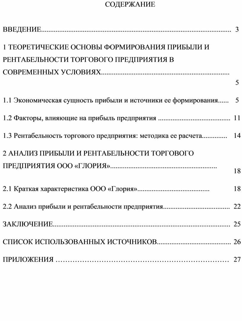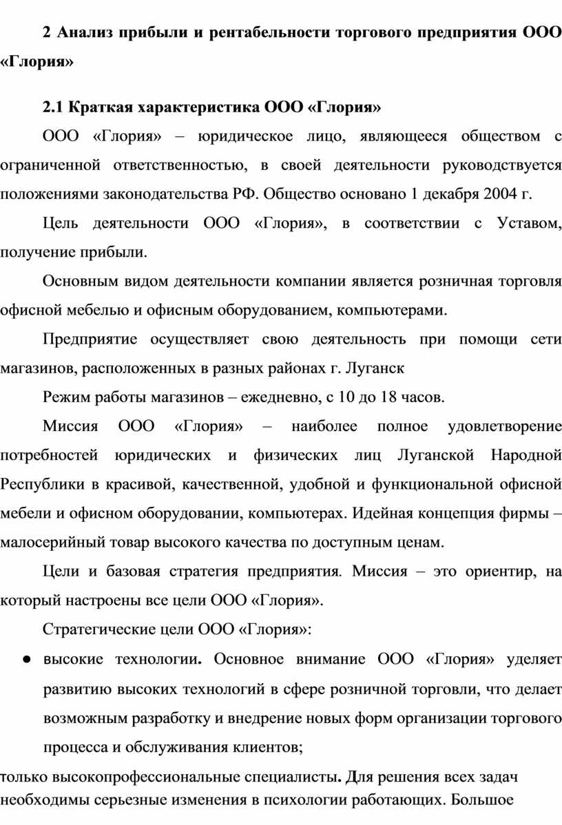 2 АНАЛИЗ ПРИБЫЛИ И РЕНТАБЕЛЬНОСТИ ТОРГОВОГО ПРЕДПРИЯТИЯ ООО «ГЛОРИЯ»........................................................... |