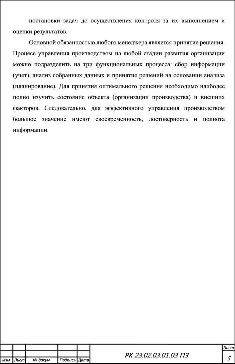 Основной обязанностью любого менеджера является принятие решения. Процесс управления производством на любой стадии развития организации можно подразделить на три функциональных процесса: сбор информации (учет), анализ собранных данных и принятие решений на основании анализа (планирование). Для принятия оптимального решения необходимо наиболее полно изучить состояние объекта (организации производства) и внешних факторов. Следовательно, для эффективного управления производством большое значение имеют своевременность, достоверность и полнота информации.