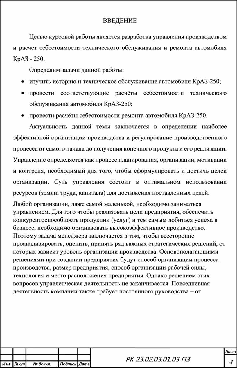 Целью курсовой работы является разработка управления производством и расчет себестоимости технического обслуживания и ремонта автомобиля КрАЗ - 250.