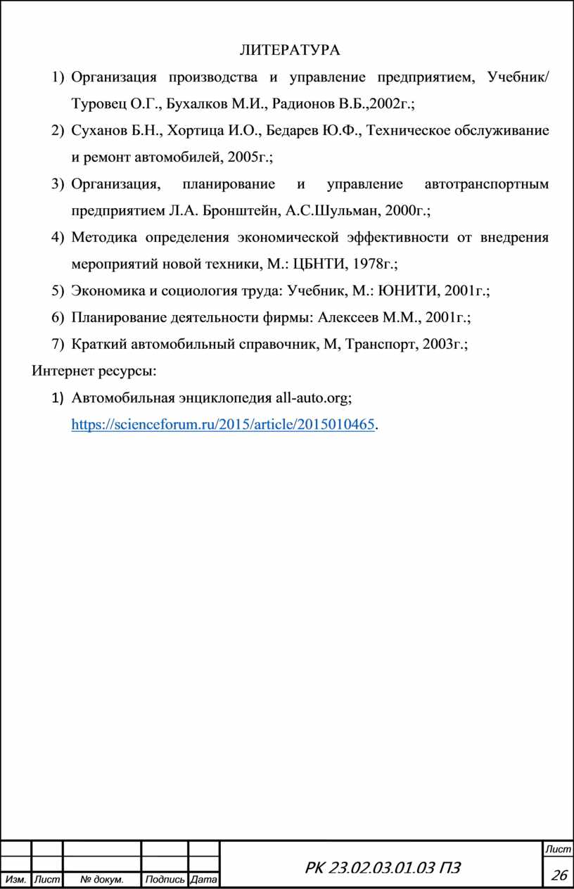2) Суханов Б.Н., Хортица И.О., Бедарев Ю.Ф., Техническое обслуживание и ремонт автомобилей, 2005г.;