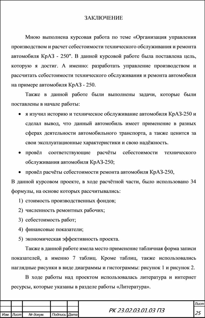 Мною выполнена курсовая работа по теме «Организация управления производством и расчет себестоимости технического обслуживания и ремонта автомобиля КрАЗ - 250". В данной курсовой работе была поставлена цель, которую я достиг. А именно: разработать управление производством и рассчитать себестоимости технического обслуживания и ремонта автомобиля на примере автомобиля КрАЗ - 250.