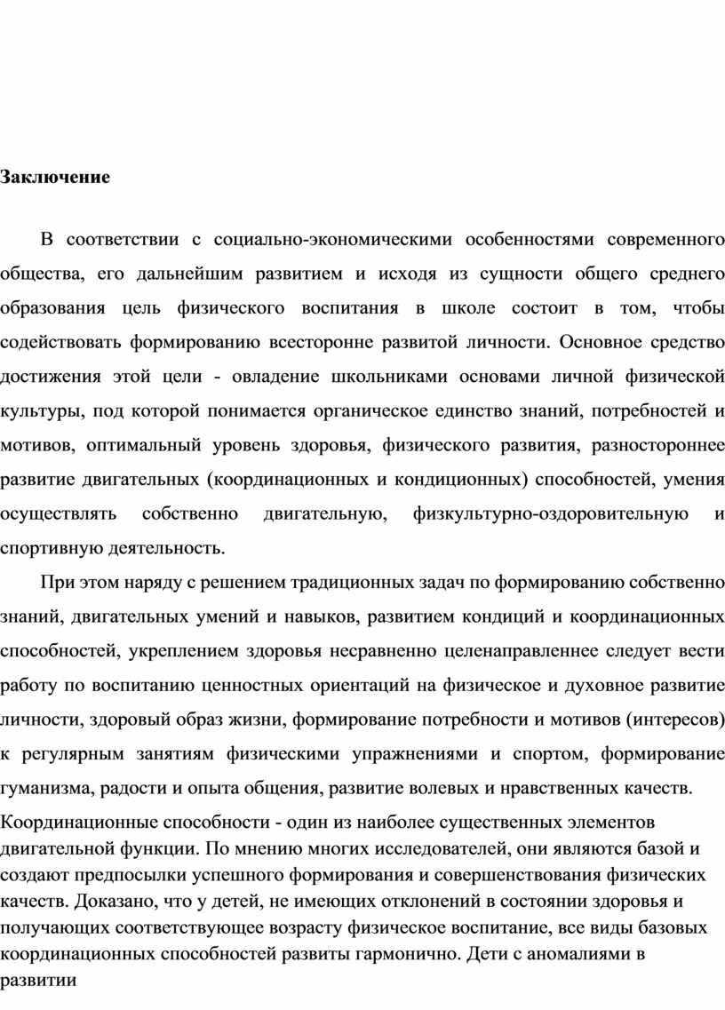 Координационные способности - один из наиболее существенных элементов двигательной функции. По мнению многих исследователей, они являются базой и создают предпосылки успешного формирования и совершенствования физических качеств. Доказано, что у детей, не имеющих отклонений в состоянии здоровья и получающих соответствующее возрасту физическое воспитание, все виды базовых координационных способностей развиты гармонично. Дети с аномалиями в развитии имеют нарушения в работе анализаторной системы, следствием этого являются отклонения в формировании механизмов координационных проявлений.