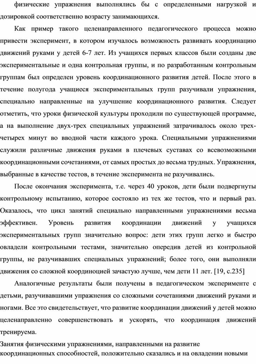 Таким образом, используя активную двигательную деятельность как форму тренировки, можно ускорить и усовершенствовать процесс развития координации движений. Однако следует помнить, что это должен быть не хаотический набор движений, а правильно и строго организованный педагогический процесс, в котором физические упражнения выполнялись бы с определенными нагрузкой и дозировкой соответственно возрасту занимающихся.